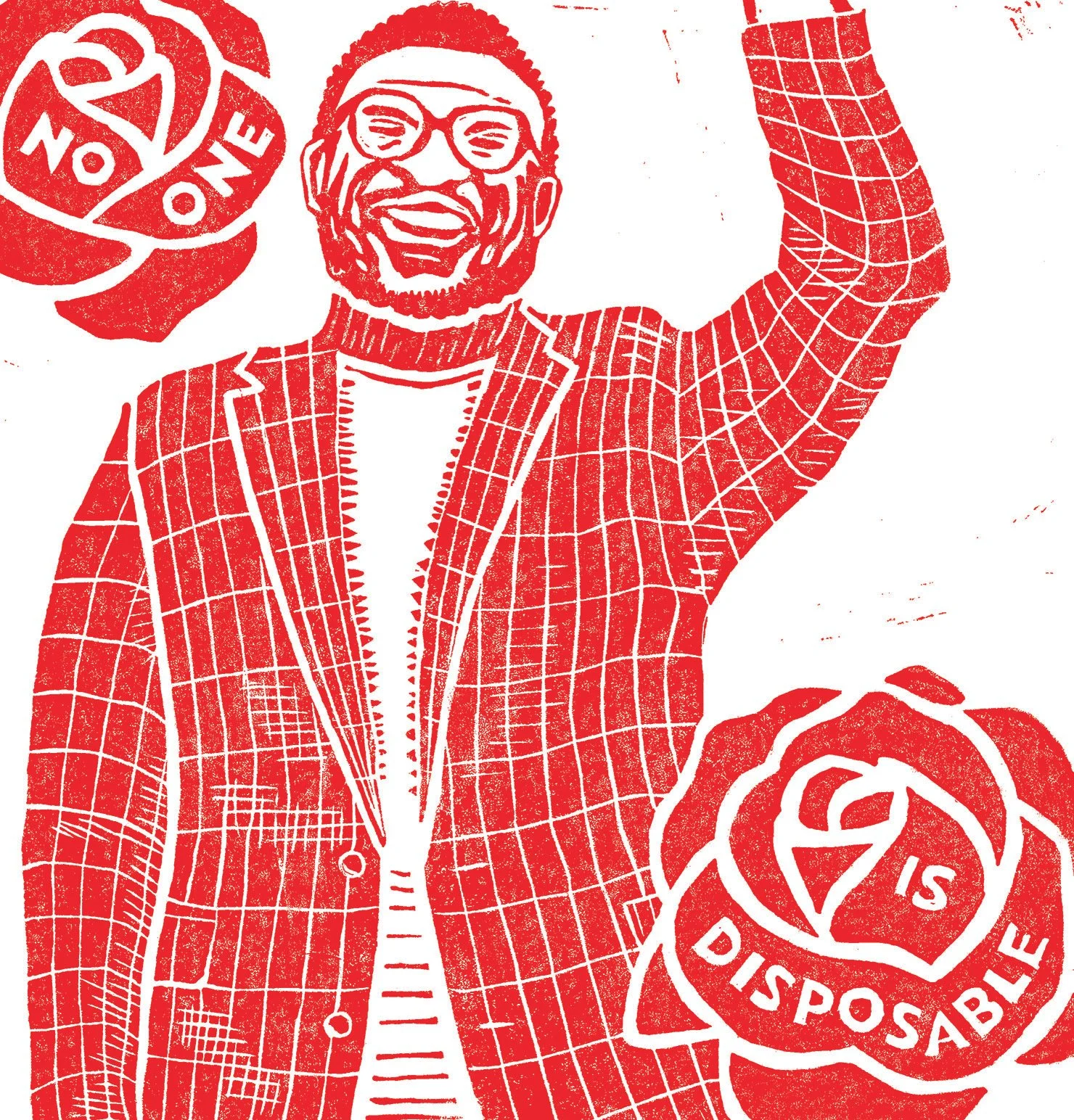 The roses represent the main icon of the Democratic Socialists of America. Embedded in the rose petals is Andrew’s campaign slogan, “No One is Disposable.”